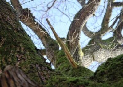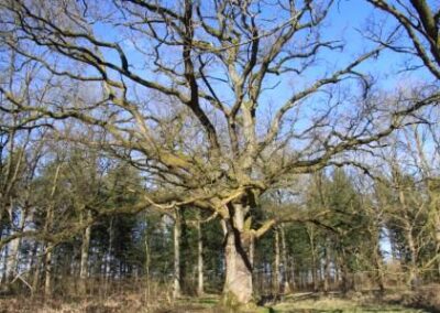 Daneben, hinter dem Kriegerdenkmal und im Sommer versteckt durch dichtes Laub steht die 1000-jährige Eiche. Nach Expertenmeinung soll sie zwar nur 900 Jahre alt sein, aber das tut ihrer mystischen Wirkung keinen Abbruch. Angeblich soll ein Kobold im Stamm hausen. Dieser hat sich aber wohl von einem Blitzschlag vertreiben lassen, der in der 60er Jahren den Stamm aushöhlte.